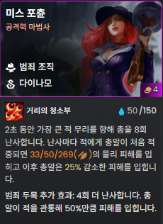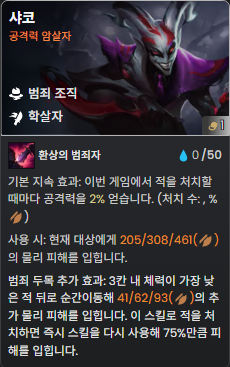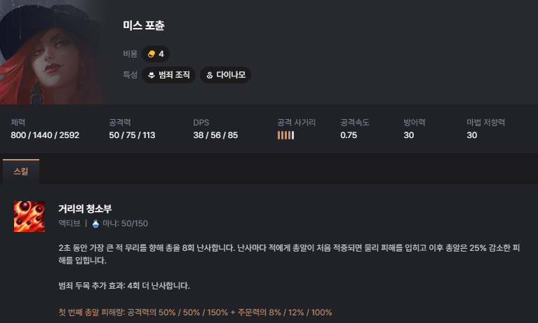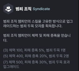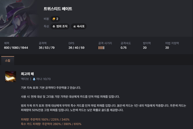 안녕하세요. 롤체 시즌 14 기물 분석 3편의 주인공은 바로 '범죄 조직' 입니다. 범죄 조직 계열 시너지는 제가 플레이를 해본 시즌 3,10,11,13 에서는 이런 형태의 시너지가 없었기 때문에 굉장히 신선하게 느껴졌습니다. 그 이유는 '두목' 을 직접 정한다는 개념 때문인데요. 범죄 조직 시너지가 활성화되면 모든 범죄 조직 기물들이 피해 증폭과 체력을 얻고, 아이템창에 '범죄 두목 모자'가 하나 생깁니다. 아이템을 주듯이 모자를 한 챔피언에게 드래그 앤 드랍을 하면, 해당 챔피언이 범죄 두목으로 임명되면서 스킬이 업그레이드됩니다. 3 시너지에서는 두목을 1명 설정할 수 있고, 5 시너지부터는 2명을 설정할 수 있습니다. 7 시너지를 활성화화면 범죄 두목 효과로 업그레이드된 스킬이 한층 더 강력하게 업그레이드되는데, 상징이 2개 필요하기 때문에 처음부터 7 시너지를 목표로 플레이하는 건 리스크가 조금 있습니다. 대신 범죄 조직 챔피언이 5명이고 5코스트 기물이 없기 때문에 어렵지 않게 5 시너지를 켤 수 있어 저점이 높다고 평가할 수 있겠죠. 그럼 범죄 조직에는 어떤 챔피언들이 있는지 함께 알아보겠습니다. 샤코는 지금 거의 두 판 중에 한 판은 3성작을 하는 사람이 보일 정도로 인기가 많은 기물입니다. 지금 글을 쓰면서 기본 스탯을 보니 샤코의 기본 공격 속도가 0.8로 근거리 딜러 치고는 매우 높은 수준이네요. 인기가 많은 이유는 당연히 강하기 때문인데 무엇이 샤코를 강하게 만드는지 이야기해 보겠습니다. 샤코는 기본 지속 효과로 시즌 13의 트리스타나처럼 적을 처치할 때마다 공격력 1.5%가 증가하는 스택형 챔피언입니다. 그래서 처음에 크립 라운드에서 샤코가 나오면 바로 올려서 스택을 쌓기 시작하면 좋습니다. 스킬을 사용하면 대상에게 물리 피해를 입히는데, 범죄 조직 두목으로 임명되면 추가 효과로 3칸 내 체력이 가장 낮은 적 뒤로 순간이동하여 추가 피해까지 입히게 됩니다. 이 효과로 인해서 샤코는 많은 적을 처치하게 되고, 그로 인해 쌓은 공격력 스택으로 계속 강해집니다. 어그로 핑퐁에도 어느 정도 도움이 됩니다. 물론 적 메인 딜러 앞에 가서 끔살당하기도 하기 때문에 개인적으로 샤코의 3신기에는 밤끝이 꼭 들어가야 한다고 생각합니다(밤끝+무대+정손). 7 범죄 조직 시너지가 활성화되면 스킬 피해량이 공격력의 50% 만큼 증가합니다. 롤체지지의 자료에서는 누락되었지만, 샤코가 스킬로 적을 처치한 경우 시즌 13의 스미치처럼 바로 다음 대상에게 스킬을 한 번 더 사용합니다. 대신 피해량은 75%로 줄어듭니다. pbe 서버 오픈 당시에는 90%였는데 샤코가 너무 강해서 이미 75%로 너프를 당한 상태입니다. 샤코는 AD 암살자에게 너무나 좋은 학살자를 직업 시너지로 받습니다. 공격력 증가+피흡이기 때문에 초반에 정손이나 피바라기를 만들기 전에도 1 코스트 난동꾼 챔피언인 문도를 넣어 학살자를 켜주면 존재감이 엄청납니다. 아무래도 샤코는 스킬 메커니즘 자체가 워낙 좋은 챔피언이라서 심각한 너프를 당하는 버전을 제외하고는 시즌 내내 많은 사랑을 받을 것 같습니다. 우연히 유튜브에서 홍승채 덱이라고 해서 시즌 3에 천상+우주해적 조합으로 다리우스를 키워서 뚝배기를 깨는 덱을 보고 재밌어 보여서 롤체를 처음 플레이하게 된 계기가 되었던 기억이 납니다. 물론 그 시즌만 하고 다시 현실로 돌아가긴 했지만요. 게다가 협곡에서 미드 라이너였던 제가 탑으로 둥지를 옮기며 다리우스가 모스트1이었기 때문에 롤체에서 다리우스를 만나면 항상 반갑고 많이 쓰게 되는 것 같습니다. 다리우스는 시즌 13과 동일하게 이번에도 협곡의 Q스킬을 가져왔습니다. 대신 1 코스트에서 2 코스트가 되면서 스킬 시전 속도가 조금 빨라졌고 스킬을 맞은 적은 파열 20%(방깎)가 적용됩니다. 그리고 이번에는 주시자가 없어지면서 난동꾼이 됐네요. 범죄 조직의 두목이 되면 스킬 사거리가 2칸이 되고, 적중한 적 1명당 체력 회복량이 증가합니다. 체력 회복량은 주문력과 최대 체력 계수, 그리고 적중한 적 1명당 증가하는 회복량은 기본 65/77/99이고 체력 계수입니다. 이 두목 효과를 극대화하는 방법이 있는데, 다른 탱커들도 다 후방으로 내리고, 다리우스 혼자 1열에 배치한 다음 가고일 구원 워모그(가고일 2개도 괜찮지만 체력 회복량이 체력 계수이고 구원의 내구도 증가까지 생각하면)를 넣으면 미친 피흡+상대방 탱라인 모두 방깎을 묻힐 수 있습니다. 그런 다음 미포가 스킬을 쓰면...탱커를 순식간에 다 녹일 수 있겠네요. 7 범죄 조직이 활성화되면 적중한 적 1명당 회복되는 체력이 (50+ 체력의 2%) 증가한다고 합니다. 최근에 보면 2코스트인 트페/다리우스를 3성작 하는 사람들도 꽤 보이더라구요. 트페는 기본 지속 효과가 재밌는데, 공격할 때마다 주문력이 2가 쌓입니다. 스킬을 사용하면 2명에게 카드를 던져 마법 피해를 입히는데, 두목 효과가 적용되면 가까운 적 3명에게 무작위의 카드를 던지는데 레드 카드는 1칸 스플래시 대미지를, 블루 카드는 피해량의 50%만큼의 고정피해를, 운이 좋으면 가끔 등장하는 골드 카드는 골드를 제공합니다. 트페는 직업 시너지로 속사포를
