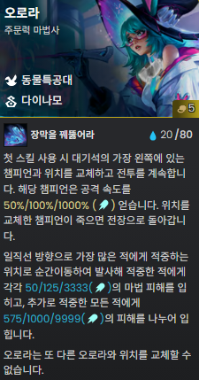 오로라 대신 전장에 투입된 챔피언은 대량의 공속(오로라의 주문력에 비례, 기본 50%)을 얻기 때문에 이론적으로는 공속을 잘 활용할 수 있는 기물을 활용하면 좋기는 합니다만, 7 동물특공대 시너지가 활성화된 상황이라면 딜은 동물특공대 챔피언들에게 맡기고 그냥 4-5코 탱커 하나 더 생기는 게 나았습니다.