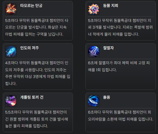 동물특공대 시너지가 활성화되면 기본적으로 동물특공대 챔피언들이 방마저와 피해증폭을 얻고, 3-5-7-10 각 단계마다 무기를 하나씩 장착하게 됩니다. 전투가 시작되면 무작위의 챔피언이 각 무기를 발동시키며 적에게 피해를 입힙니다.