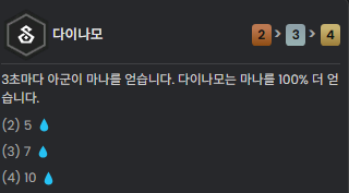 마나통이 80으로 작은 편은 아니지만 직업 시너지가 다이나모이기 때문에 진을 넣어 다이나모를 받아주시면 3초마다 10의 마나를 얻을 수 있어 스킬을 더 빨리, 자주 쓸 수 있습니다.