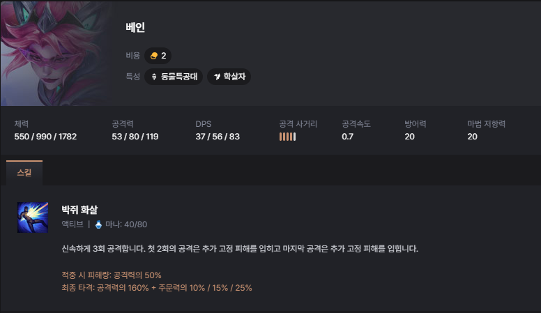베인은 평타 딜러이고 자야는 스킬 딜러여서 3신기를 공유하지는 않지만, 동물특공대로 덱 방향성이 정해졌다면 유일하게 자야의 아이템을 쓸 수 있는 기물입니다. 구인수냐 쇼진이냐의 차이만 있을 뿐, 무한의 대검은 공통적으로 좋은 아이템이기에 제일 먼저 만들면 좋습니다. 만약 기물 상황이 5 동물특공대까지는 되지 않고 3 동물특공대 상태로 빌드업을 지속하게 된다면, 같이 학살자를 받는 세나에게 자야의 아이템을 주고 빌드업하는 것도 나쁘지 않습니다. 개인적으로는 세나의 기물 성능이 그렇게 좋지는 않다고 느껴서 세나가 먼저 2성이 찍히는 상황이 아니라면 베인에게 아이템을 넣는 것이 좋다고 생각합니다.