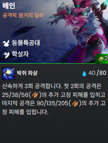베인의 스킬은 협곡의 w와 비슷하게 3타가 강화됩니다. 스킬이 발동되면 기본 공속보다 더 빠른 속도로 3회를 공격하는데, 3타는 1,2타의 3.5배 정도 피해를 입힙니다.