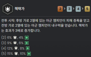유미의 직업 계열 시너지 중 하나인 책략가 시너지는 전방 2열에게는 내구력을, 후방 2열에게는 피해 증폭을 제공하는 아군 전체 버프입니다. 책략가는 3배의 효과를 얻습니다. 동물특공대를 할 때 좋은 점 중 하나는, 유미의 책략가 시너지를 활용해 초중반에 에코를 쓰거나, 8렙에서 니코를 쓰는 방식으로 탱라인을 유연하게 구성할 수 있다는 점입니다. 기본 레오나에 세주아니가 잘 뜨면 세주아니로 요새를, 니코가 잘 뜨면 니코로 책략가를 받으면서 레오나의 부족한 탱킹력을 유연하게 대처할 수 있으니 기억해 두시면 좋습니다. 저는 보통 니코나 세주아니로 8렙을 넘긴 후에 9렙에서 레넥톤이 뜨면 교체해 줍니다.