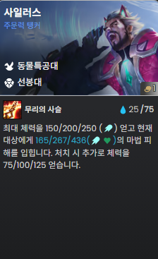 동물특공대의 마지막 챔피언, 사일러스입니다. 한 시너지에 8개의 기물이 있으니 조금 빡세네요. 하지만 거리의 악마들이 아직 남았는데 하핳핳... 사일러스도 1 코스트 치고는 스킬에 특이점이 있는데요. 스킬을 사용하면 단순히 체력을 회복하는 것이 아니고 주문력에 비례해 최대 체력을 얻은 다음 단일 대상에게 마법 피해를 입힙니다. 게다가 탱커에게는 다소 어울리지 않게 스킬로 적을 처치하는 경우 추가로 체력을 얻습니다.