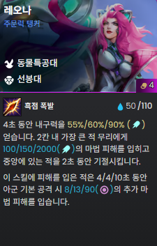 레오나는 같은 동물특공대인 사일러스와 함께 선봉대를 받는 메인 탱커로 4라운드에서 자야보다 더 높은 우선순위로 2성을 찍어야 하는 기물입니다.