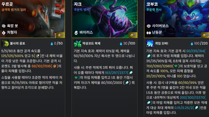오로라와 교대할 챔피언을 추천드리자면, 시너지가 없어도 cc로 어느 정도 밥값을 해주는 코부코(에어본)와 자크(기절), 딜러 중에는 증가한 공속을 잘 활용할 수 있 스킬에 처형이 달려있는 우르곳이 있겠습니다.
