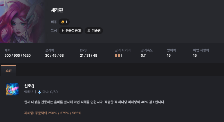 세라핀을 많이 써보신 분들은 비슷하게 느끼셨을 것 같은데 초반에 2성작이 되면 굉장히 강력합니다. 스킬을 사용하면 1 코스트 챔피언에게 어울리지 않는 광범위한 음파를 날리는데 탱커들을 관통해 후방 딜러에게까지 닿습니다. 물론 적중한 적 하나당 피해량이 40% 감소해서 초반부터 2-3개의 탱템을 두른 탱커를 뚫는데 어려움을 겪기는 하지만, 아군의 탱커 라인이 2성작이 되어 든든한 상태라면 세라핀이 혼자서 다 잡는 그림이 많이 나옵니다.