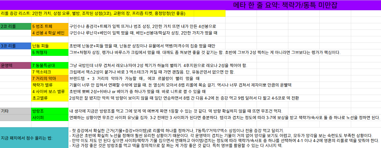 안녕하세요. 롤체 시즌 14 가 시작된 지 일주일 정도 지난 지금, 저도 최대한 시간을 내서 플레이 하며 쌓은 데이터를 통해 어느 정도 메타에 대한 감이 잡히는 것 같아서 정리를 해보았습니다. 새로운 패치가 적용되면 일단 박치기를 하며 데이터를 쌓은 후 어느 정도 감을 잡으면 항상 작성하는 셀프 패치노트입니다. 지난 시즌에 처음 해봤는데 머릿속이 정리되면 플레이도 더 깔끔하게 나오더라구요. 지금 게임을 시작하면 보통 연패 책략가 2명, 동물특공대 2명은 거의 기본으로 나오는 것 같습니다. 그런데 아직 패치가 되지 않은 상태이다 보니 밸런스가 그렇게 좋은 편이 아니어서 저 2개의 덱을 피해 빈집으로 날먹하는 방식이 잘 통하지 않습니다. 그래서 최대한 정찰을 자주 하면서 책략가와 동물특공대를 우선적으로 고려하면 점수를 올리는 데 도움이 됩니다. 그런데 롤체라는 게임의 근간인 '운'이라는 요소를 최대한 배제하고 싶은 저같은 사람들은 영원히 찍히지 않는 레오나/자야 2성, 죽음의 올페어 책략가 같은 상황을 몇 번 경험하고 나면 현타가 강하게 올 수 있습니다. 그래서 책략가와 동물특공대가 아니더라도 최소 순방이 가능한 덱들을 나열하였습니다. 각 덱의 디테일들은 이미 마스터를 달성한 괴물 유튜버분들의 영상을 참고하시면 큰 도움이 됩니다. 저도 그렇게 배우고 있습니다. 현메타를 빠르게 정리하자면, <2코 리롤 - 베인 / 트페 > 2코 리롤 베인과 트페 모두 쌍구인수를 쓰기 때문에, 크립에서 주는 아이템으로 구인수각이 나올 때만 가는 것을 추천드립니다. 그렇지 않아도 갈 수 있는 경우는 별밤이나 2만한 가치, 프리즘티켓 같은 강력한 리롤 증강을 먹었을 때입니다. <3코 리롤 - 렝가 / 피들> 개인적으로 5 처형자 리롤덱은 각이 나와서 할 때마다 1-2등을 한 것 같습니다. 다만 렝가는 시즌 13의 스미치처럼 연패 시너지를 보유한 기물이 아니기 때문에 연패하면서 대깰로 가기에는 부담이 있습니다. 그레이브즈가 초반에 빠르게 2성작이 되거나, 크립에서 렝가, 바루스가 뜨는 경우, 첫 증강으로 처형자 상징이나 전용 증강이 뜨면 대깨를 쳐도 충분히 순방이 가능하다고 보고 있습니다. 6 난동꾼 피들스틱 리롤은 아래의 두 조건 중 하나 이상이 충족될 때만 하고 있습니다. 1. 유물 증강이나 차원문을 통해 역병의 보석이나 저격수의 집중을 먹었을 때 <운영덱 - 동물특공대 / 엑소테크 / 거리의 악마 / 책략가> 동물특공대는 전용 무기의 힘으로 초반부터 쭉쭉 연승을 할 수 있어 쉽고 강한 덱입니다. 그래서 누구 한 명이 동물특공대 상징을 먹은 것이 아니라면 매 판 최소 2명은 하는 것 같습니다. 제가 많이 하면서 찾은 깨알팁 하나는, 상징 없이 8렙 단계에서 레오나 2성이 안 찍히면 탱킹이 매우 약한데, 이때 진을 내리고 세주아니를 넣어서 일라오이와 2요새를 받으면 9렙을 갈 수 있는 힘이 생깁니다. 덱이 지금 약간 날먹이라 2-1에 3 동물특공대가 켜지거나, 사일러스와 세라핀이 2성작되거나 베인이 빨리 뜨면 그냥 가시면 됩니다. 자야의 템도 통계를 보면 완벽한 3신기가 없는 상황이라 자유도가 높습니다. 엑소테크는 아이템 목록에 유동콘덴서가 없으면 안 가는 게 좋습니다. 힘이 많이 빠집니다. 거리의 악마는 동물특공대 만큼 강하지는 않지만 초반에 기물이 잘 붙으면 연승하면서 가기 쉽고, 브랜드 2성작이 어렵지 않습니다. 다만 책략가와 많은 기물을 공유하기 때문에 연패를 한 경우에는 반등이 어렵습니다. 피관리 상태가 좋을 때만 추천드립니다. 책략가는 무슨 덱을 해야 할지 모르겠다 싶으면 연패하면서 가시면 됩니다. 어차피 8렙 영혼의 리롤 대결이라 잘 붙으면 그냥 순방입니다. 연패 중에 사이퍼 기물을 집어 조금이라도 보상을 받으면 좋습니다. <기타 - 사이퍼 / 방랑하는 조련사> 크립에서 드레이븐이나 갈리오가 뜨면 그냥 연패 사이퍼 하시면 되겠습니다. 3-7에서 보상을 받을 때 기물이나 아이템, 덱이 겹치는 상황 등을 고려하여 사이퍼 기물 다 팔고 책략가로 갈지, 사이퍼 기물 3개(갈리오/드레이븐/제드)를 살려서 4 요새 2 속사포를 갈지 결정합니다. 만약 꼬마 거인이나 거대한 거인 등의 체력 회복 증강을 먹은 경우에는 4-3, 4-7에서 사이퍼 보상을 받는 대장정에 도전해도 좋습니다. 그리고 지금 방랑하는 조련사의 밸류도 나쁘지 않다고 보고 있습니다. 겹치는 덱이 많아 어지러운 이 판국에, 방랑조로 기깔나는 조합을 짜면 풀연승 피 100 우승도 가능했습니다. 물론 방랑조는 증강 자체가 도박이니 참고 부탁드립니다.ㅋㅋ 다들 새로운 패치가 나오기 전에 많이 많이 점수 올리시길 바라겠습니다! 그럼 저도 게임하러 갑니다.