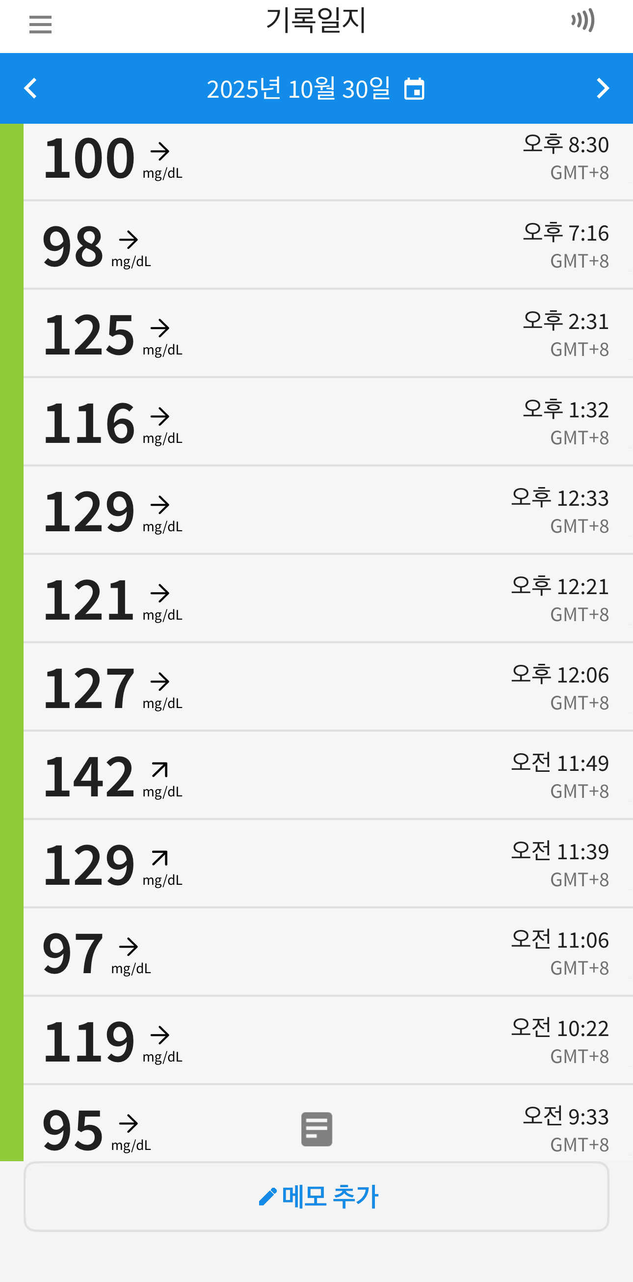 저의 혈당 기록인데 아래 메모 추가 버튼을 눌러 운동이나 먹은 것을 기록할 수도 있더라구요. 그래프로도 볼 수 있어요.
